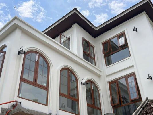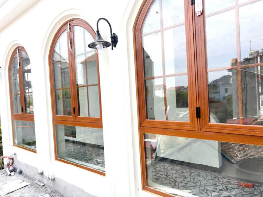 Một trong những điểm nổi bật của công trình là việc sử dụng nhôm Xingfa nhập khẩu màu vân gỗ, mang đến cảm giác ấm áp, sang trọng và gần gũi cho tổng thể kiến trúc.