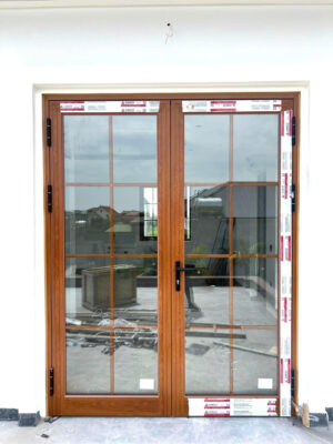 Tông màu vân gỗ giúp bộ cửa nổi bật nhưng vẫn giữ được sự hài hòa với phong cách nhà ở hiện đại.